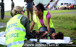 남태평양의 바누아투 섬에서 태풍 '팸'의 여파로 어린 소년이 호주 의사로부터 치료를 받고 있다.