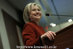 미국 워싱턴의 국제 전략 연구센터에서 열린 정치보고 우수 시상식에서 전 국무장관 힐러리 클린턴이 토너상을 시상 후 소감을 이야기하고 있다.