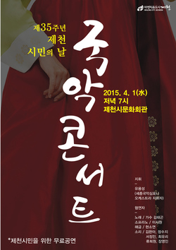 충북 제천시는 제35주년 제천시민의 날을 기념하여 제천시의 새로운 도약과 화합을 도모하고 다양한 문화공연을 즐길 수 있는 기회를 갖고자 4월 1일 저녁 7시에 제천문화회관에서 국악콘서트를 개최한다.