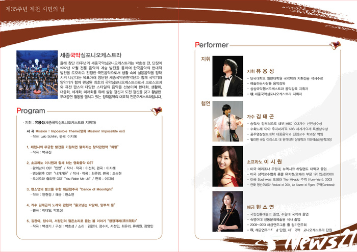 이번에 개최되는 국악콘서트는 모든 제천 시민들이 쉽고 편하게 국악을 즐길 수 있도록 미션임파서블, 왕의남자, 로미오와 줄리엣 등의 영화음악 OST를 국악으로 연주하여 기존 국악공연과 차별화된 친근하고 익숙한 퓨전 국악콘서트로 제천 시민을 찾아간다.