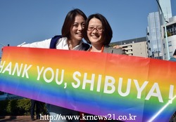 일본의 레즈비언 커플이 도쿄 시부야 구청에서 게이 커플 협력 인증서 발급이 결정돼 환하게 미소를 띄고 있다.