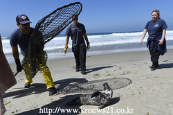 미국 캘리포니아 라구나 바다에서 해변가로 좌초된 바다사자가 구조되었다.