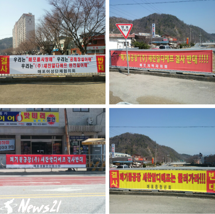 한편 매포지역주민들은 이 업체가 각종 불법행위를 계속하고 있고 환경을 오염시키고 있다며 현수막 등을 내 걸고 단양군의 허가취소를 요구하고 있다.