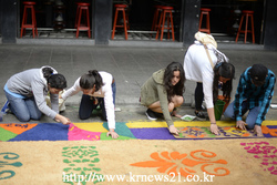 과테말라에서 새로운 기네스 세계 기록을 시도하기 위해 자원봉사자들과 과테말라 시티 직원들이 2,300미터 카펫 위에 꽃과 다양한 색깔의 톱밥을 이용해 작업을 하고 있다.