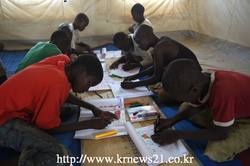 나이지리아 바가솔라의 난민 캠프에서 유니세프에서 주관하는 심리 치료 관리 프로그램에 아이들 참여해 그림을 그리고 있다.