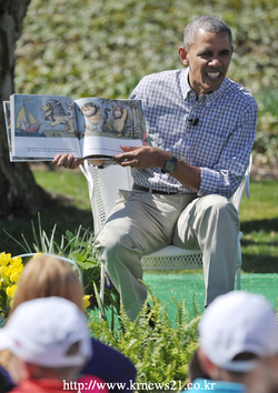 미국 버락 오바마 대통령이 백악관에서 열린 부활절 행사에서 아이들에게 동화책을 읽어주고 있다.