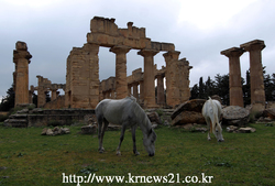 리비아 수도 벵가지 동부의 샤하트에 기원전 630년 그리스에 의해 세워진 키레네에서 말들이 풀을 뜯어 먹고 있다.