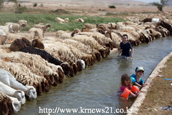 요르단강 서안지역의 웨스트 뱅크에서 이스라엘 아이들이 유대인의 유월절 기간을 맞이해 양들과 함께 수영을 하고 있다.