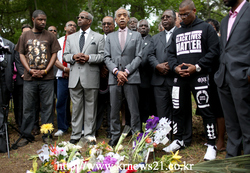 미국 사우스캐롤라이나에서 경찰에 의해 살해된 월터 스콧의 추모 기념관에서 앨 샤프턴 목사와 함께 시민들이 기도를 하고 있다.