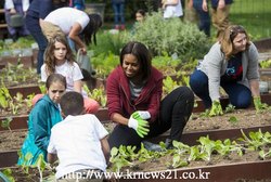 미국 미셸 오바마 영부인이 워싱턴 DC 백악관 사우스론에서 열린 식목일 행사에서 학생들과 함께 채소를 심고 있다.