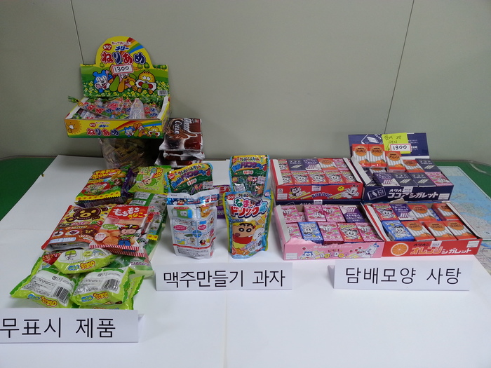 이들 식품은 한글표시사항이 전혀 없어 제품명 및 성분명‧유통기한까지 확인할 수 없는 수입과자였다. 나머지 4개 업체는 영업신고를 안하거나 유통기한 등 표시사항이 전혀 없는 제품을 판매하다 적발됐으며, 유통기한 경과제품 판매도 2개소가 있었다.