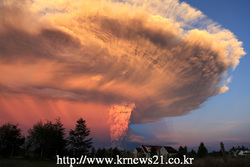 칠레 남부의 칼부코 화산 분출로 화산재와 용암의 높은 열로 하늘이 붉게 물들었다.