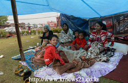 네팔에서 7.9 규모으 대지진으로 3,200여명이 숨지고 집을 잃은 생존자들이 도로 옆에 임시 대피소를 만들었다.
