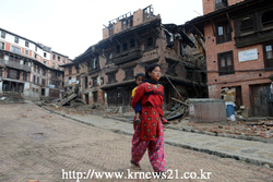 네팔 카트만두에서 한 여성이 지진으로 인해 붕괴된 집을 지나가고 있다.
