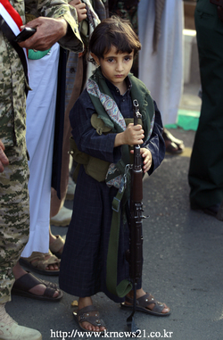 예멘 수도 사나에서 사우디 주도 연합군의 공습에 대응하는 시아파 후티 반군의 지지자 중 한 명인 한 아이가 총을 들고 서있다.
