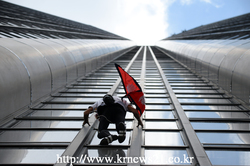 프랑스에서 네팔 지진 피해자들을 위로하고 지원을 촉구하기 위해 고층 건물 등반가인 알랭 로베르가 네팔 국기를 달고 210m의 몽파르나스 빌딩을 오르고 있다.