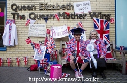 영국 왕실 윌리엄 왕세손과 캐서린 왕세손빈의 둘째 출산이 가까워지면서 병원 앞에서 한 노부부가 아이의 성공적인 출산을 기념하는 퍼모먼스를 하고 있다.