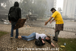 브라질 쿠리티바에서 교사 연금을 줄이는 새로운 법안에 대한 항의 도중 부상 당한 교사가 도로 위에 쓰러져 있다.