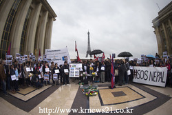 프랑스 파리 에펠 탑 앞에서 네팔 지진 구호를 촉구하기 위해 시민들이 모였다.