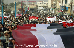 예멘 수도 사나에서 시아파 후티 반군 시위대가 예멘 국기를 들고 사우디 주도 연합군의 공격에 반대하는 항의를 벌이고 있다.