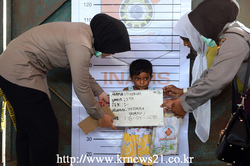 인도네시아 아체주의 쿠알라 랑사 항구에 위치한 임시 대피소에서 미얀마와 방글라데시아인 로힝야족 난민이 구조돼 가족 찾기를 위한 사진을 찍고 있다.