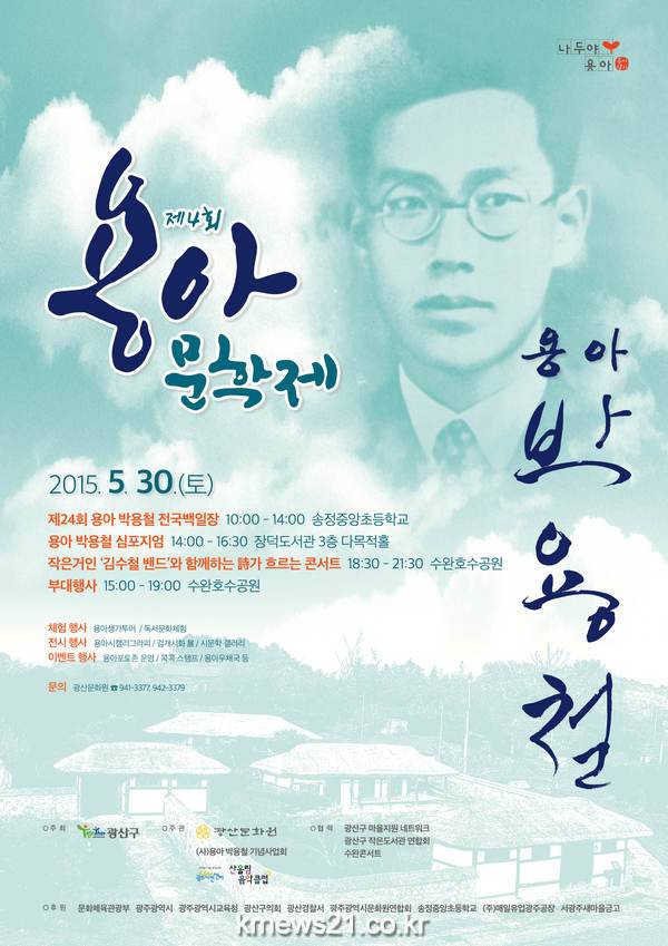 콘서트 말고도 오전 10시부터는 송정중앙초등학교에서 초·중·고 및 일반부로 나눠 ‘제24회 용아 박용철 전국 백일장’이 열린다. 글짓기와 그리기 대상에는 각각 문체부장관상과 광주시교육감상과 함께 부상을 준다. 참가 신청은 29일까지 광산문화원(062-941-3377)에서 받는다.