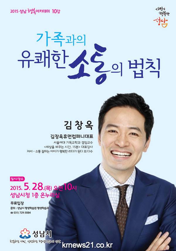▲ 성남행복아카데미-가족과 유쾌한 소통의 법칙 리플릿성남시는 5월 28일 ‘소통의 달인'으로 불리는 스타강사 김창옥 휴먼컴퍼니 대표를 초빙해 성남 행복아카데미를 연다.