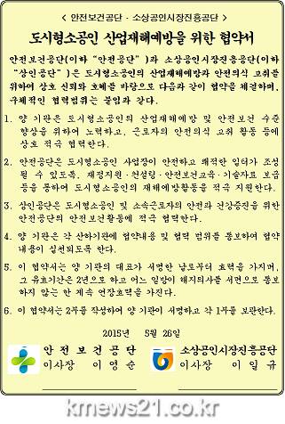 안전보건공단은 5월 26일 오후 5시에 대전에 소재한 소상공인시장진흥공단에서 소상공인시장진흥공단(이사장 이일규)과「도시형 소공인 산업재해예방을 위한 업무협약」을 체결했다.