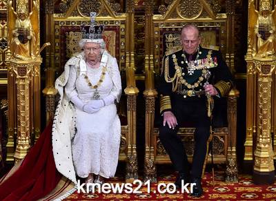 ▲ 英 의회 개원 연설을 준비하고 있는 엘리자베스 여왕과 에딘버러 공작의 모습 ⓒAFP영국 런던의 웨스트 민스터 궁전에서 엘리자베스 여왕과 에딘버러 공작이 보좌에 앉아 의회 개원 연설을 준비하고 있다.
