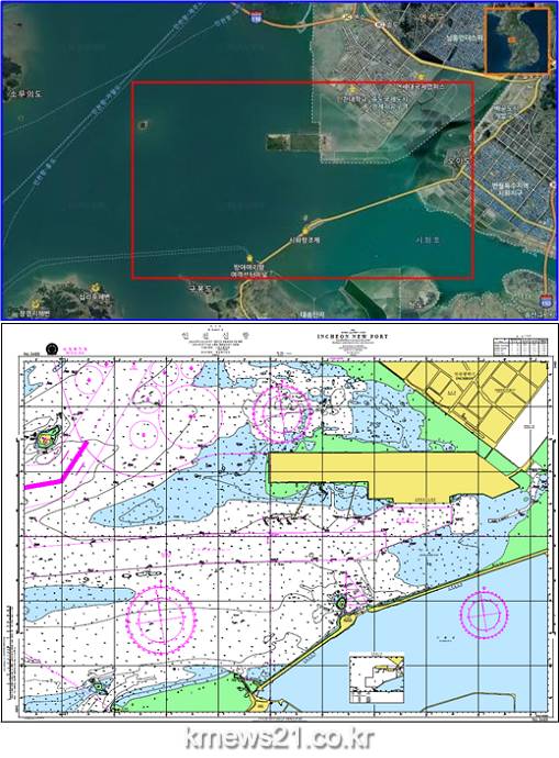 ▲ 간행구역도(위), 신간 해도(아래)해양수산부 국립해양조사원은 인천신항 1단계 개장일인 6월 1일에 맞춰 대축척 신간 해도를 간행하였다.