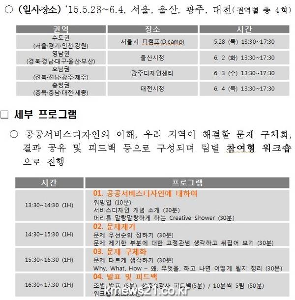 광주광역시는 3일 광주디자인센터에서 지역주민, 전문가, 공무원이 함께 논의해 정책과제를 도출할 수 있도록 교육하기 위한 호남·제주권 정부3.0 국민디자인과제 워크숍을 행정자치부 주관으로 개최한다고 밝혔다.