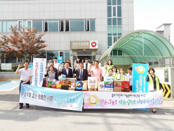 국민건강보험 충북 충주지사와 충주종합사회복지관이 지난2일 출근시간 국민건강보험 1층 본관에서 ‘나눔 문화 확산을 위한 작은 나눔 작은 실천’ 기부이어달리기 행사를 진행했다.