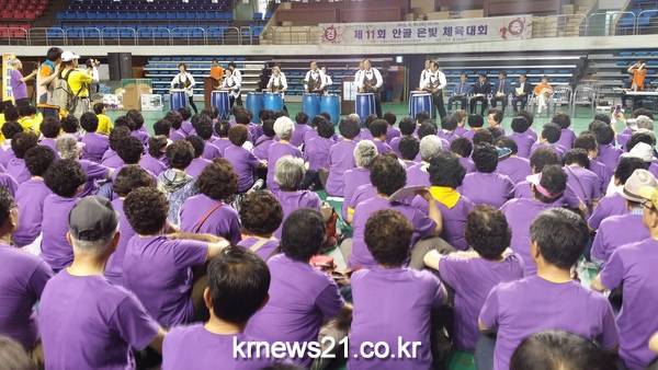 ▲ 안골은빛체육대회이날 운동회는 어르신 난타공연단의 식전공연을 시작으로 응원전 및 에어사다리게임등 다양한 운동경기가 진행되었고, 푸짐하고 맛있는 도시락 점심과 경품행사등 다양한 행사진행으로 어르신들이 즐거운 하루를 보내는 시간이 되었다. 특히 효사랑요양병원의 어르신 기초건강체크와 당뇨검사등 의료봉사활동으로 어르신들의 건강을 확인해보는 시간이 되었으며, 양구청 자원봉사자들과 한일장신대학교의 학생 자원봉사자들이 참여하여 행사에 도움을 주어 의미를 더했다. 또한 경기 중간 틈틈이 회원들이 그동안 배우고 익힌 댄스스포츠, 생활체조, 난타 등 흥겨운 공연을 곁들여 참여자 모두 한마음 한뜻이 되어 흥겨운 시간을 보냈다.