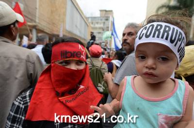 ▲ 온두라스 대통령 사임 시위서 `부패`를 나타낸 머리띠를 한 아이의 모습 ⓒAFP 온두라스 수도 테구시갈파에서 후안 올란도 헤르난데스 대통령의 사임을 요구하는 항의 시위가 벌어졌다.