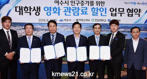 주철현 여수시장은 메가박스여수 이대안 대표, 전남대 여수캠퍼스 송현종 부총장, 한영대학 임정섭 총장과 함께 인구증가와 대학생 복지증진을 위한 ‘영화관람료 지원 업무 협약’을 4일 시청 시장실에서 체결하고 학생 1인당 3000원씩(여수시 1000원, 메가박스 2000원) 지원키로 약속했다.