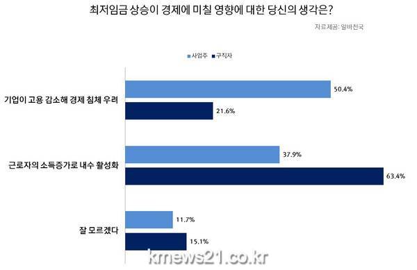 최근 정부에서 ‘최저임금 인상’을 경기침체 해결 방향으로 주요하게 논의하고 있는 가운데, 최저임금 인상에 따른 경제회복 가능성에 실제 구직자와 사업주 간 판이한 시각차가 눈길을 끈다.