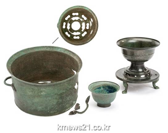 ▲ 율리 영축사지 출토 청동유물 일괄문화재청의 허가를 받아 울산박물관이 발굴조사 중인 율리 영축사지(울산광역시 기념물 제24호)에서 청동향로, 청동시루, 청동완(盌, 사발) 등 고려 시대 청동유물이 출토되었다.
