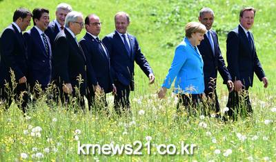 ▲ G7정상들이 독일에 모여 정상회담을 가졌다. ⓒAFP독일 남부 바이에른주의 소도시 가르미슈 파르텐키르혠의 엘마우 호텔 앞에서 G7 정상들이 들판을 걷고 있다.
