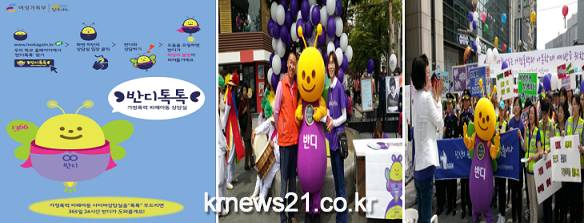 ▲ ‘반디톡톡’ 홍보 포스터와 ‘반디톡톡’ 보라데이 캠페인 연계 홍보(‘15.5.8. 의정부) 여성가족부는 아동학대의 80% 이상이 부모에 의해 발생한 가정폭력으로 보고되는 가운데 피해아동이 자신의 신분을 밝히지 않고, 온라인으로 피해 사실을 알릴 수 있는 ‘반디톡톡’이 경기도에서 중점 운영된다고 6월 8일(월) 밝혔다.