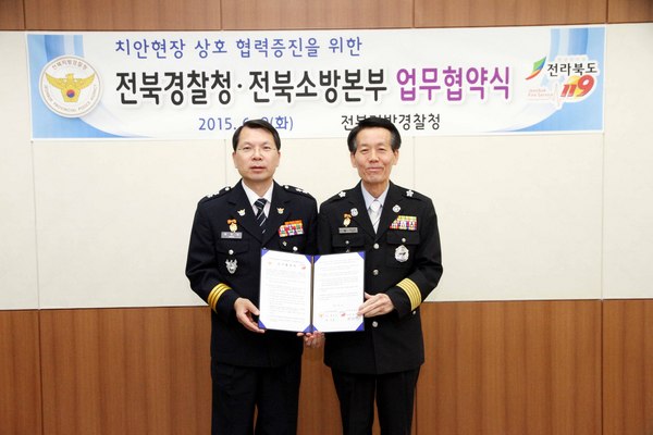 전북지방경찰청(청장 홍성삼)은, 9일 오전 전북소방본부(본부장 정완택)와 함께 각종 사건‧사고에 대한 양 기관의 신속하고 능동적인 공동대응을 위한 업무협약(MOU)를 체결하였다. 이 날 체결한 업무협약은 도민의 생명과 안전이 최우선임을 다시 한 번 확인하고, “안전한 전북”을 만들기 위해 양 기관의 유기적‧능동적인 협력체계를 더욱 공고히 하기 위한 것이며, 본 업무협약의 주요내용으로는, 각종 행사시 상호협력, 안전사고 방지 대책 강구, 대테러 공동대응 및 교육을 통한 유기적 협력체제 구축, 화재조사 협력 및 화재원인 감식‧감정내용 상호 공유, 공무집행 방해사범 발생시 신속출동 및 엄정한 법집행 등이다.