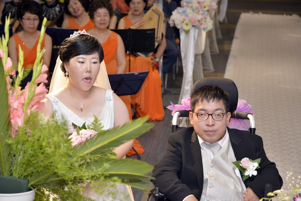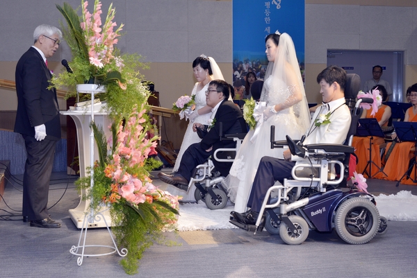 저희들이 결혼하게 될 줄은 생각도 못했습니다. 방에서 세상 구경도 못하고 살다 죽겠구나 하는 절망 속에서.......” 지난 2일 오후 6시. 전북여성일자리센터 별관 2층에서 턱시도를 차려입고 휠체어를 탄 신랑, 하얀 웨딩드레스를 곱게 차려입은 신부, 2쌍의 장애인 부부의 결혼식이 진행되었다.