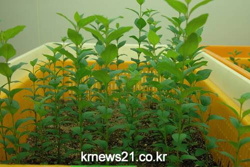 ▲ 미세삽목법으로 증식된 희귀식물 미선나무가 건강하게 잘 자라고 있다.국립산림과학원은 희귀식물 미선나무를 대량으로 증식하는 조직배양과 미세한 삽목기술(이하 미세삽목, micro-cutting) 기술을 완료해 일반인에게 공개한다고 3일 밝혔다.
