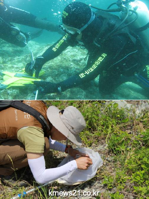 ▲ 해양 분야 수중 조사 현황 사진(위), 육상곤충 현장 조사(아래)국립공원관리공단이 지난해 한려해상국립공원과 태안해안국립공원을 대상으로 자연자원조사를 실시한 결과, 공원 내 살고 있는 야생생물 종류가 10년 전에 비해 78%와 105%로 각각 증가한 것으로 나타났다.
