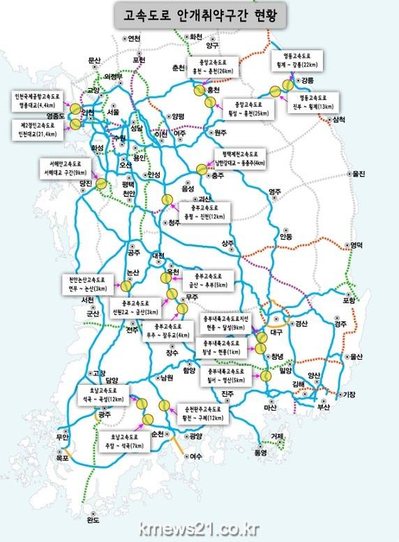 국토교통부는 짙은 안개가 빈번히 발생하여 대형사고가 우려되는 고속도로 19개 구간, 197.8km를 선정하고 구간별 개선대책을 마련하였다. 이러한 ‘안개취약구간’ 에서는 안전시설을 대폭 보강하고 관리자 교육, 훈련을 주기적으로 실시하는 등 안전관리 전반이 강화된다.