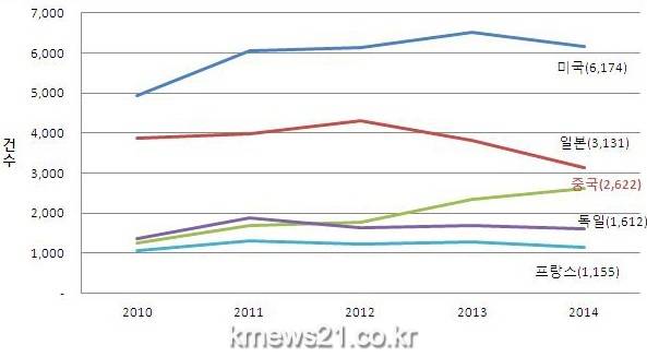 특허청(청장 최동규)에 따르면, 최근 5년간 중국의 한국에 대한 상표 출원은 2010년 1,246건에서 2014년에 2,622건으로 2배 이상 증가했다.