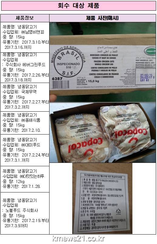 회수 대상은 ㈜남영비앤피, 주식회사 에버그린푸드 등 7개 수입업체가 수입한 냉동닭고기 제품이다. 참고로, 해당 브라질 작업장에서 가공된 닭고기의 수입이 지난 5월 27일 금지되었다.