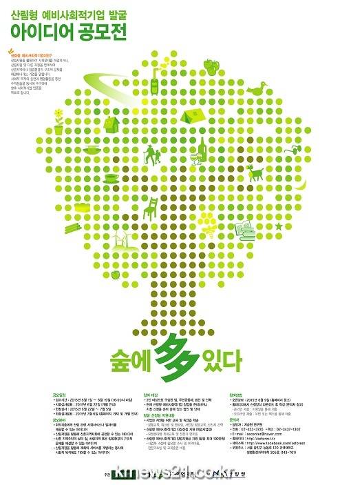 공모분야는 취약계층에게 산림 관련 사회서비스나 일자리를 제공할 수 있는 아이디어, 산림자원을 활용해 산촌지역사회에 공헌 할 수 있는 아이디어 등이다. 서류접수는 오는 6월 19일까지이며, 서류심사와 현장심사를 거쳐 7월 6일 최종 15개팀 이상의 아이디어를 발굴 선정할 계획이다.