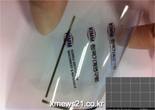 ▲ 미세 배선 인쇄를 통해 구현한 투명 전극 샘플미래창조과학부(이하 미래부) 산하 한국기계연구원(이하 기계연)의 이택민 박사 연구팀이 세계 최초로 롤프린팅 기술을 이용해 인쇄전자(잉크로 신문을 인쇄하듯, 스마트폰, 터치스크린, 휘어지는 디스플레이 등의 복잡한 전자회로를 전자잉크로 인쇄하는 것) 선폭을 1마이크로미터(㎛)로 구현하는 데 성공했다. 2020년 331억 달러에 달할 것으로 보이는 세계 인쇄전자 시장에서 한걸음 앞서 나갈 수 있는 디딤돌을 마련한 것이다.