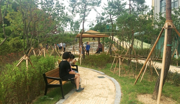 이를 투입해 학교 내 1,314㎡ 규모의 자투리땅에 소나무, 금목서, 산딸나무 등 교목 41주와 홍가시, 조팝나무 등 관목 1407주를 심고 정자와 의자를 설치했다.