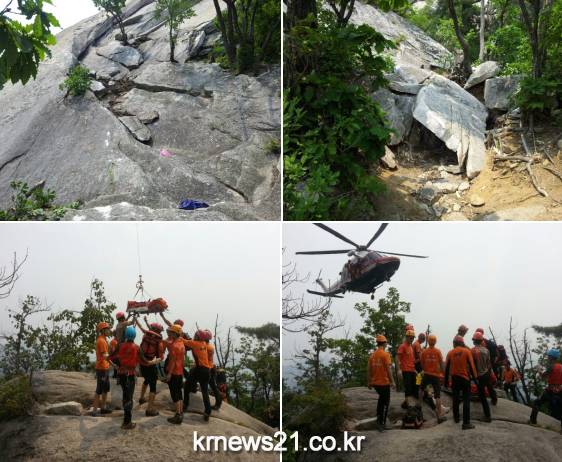 ▲ 6.13.북산한 인수봉 암석 사고 사진(위)과 구조 모습(아래)국립공원관리공단은 6.13.(토) 오전 09시 55분경에 북한산국립공원 인수봉 암벽등반 코스에서 등반대기중인 10여 명의 하중에 의해 밀려 떨어진 암석으로 안전사고(사망 1명, 부상3명)가 발생함에 따라 전국 국립공원의 암벽등반 구간에 대해 긴급 점검에 나섰다.